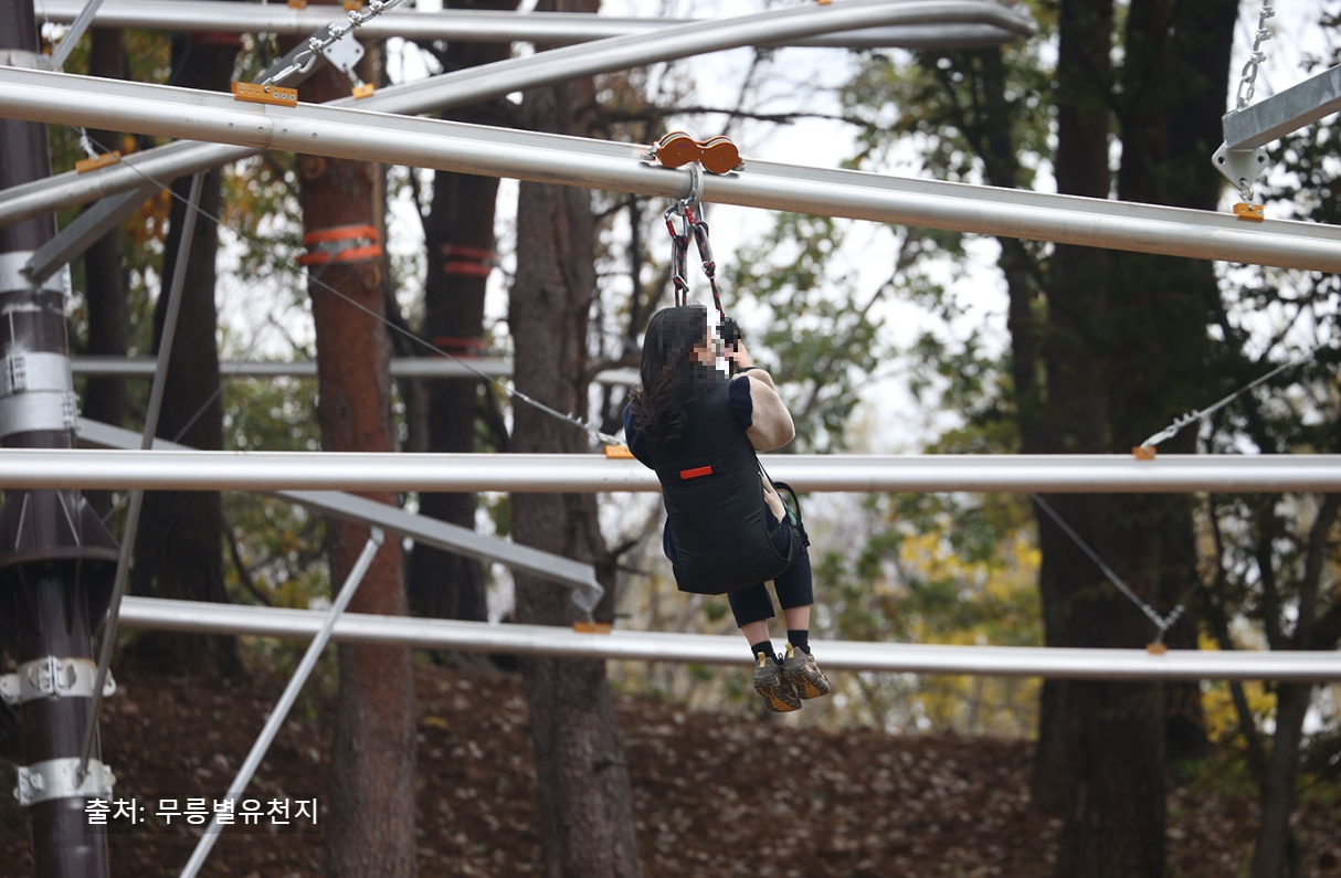 - 일반 직선형이 아닌 곡선 레일을 따라 시속 40km로 활강하는 짚라인입니다.