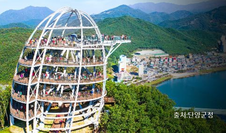 - 남한강과 단양 시내, 소백산을 360도 파노라마로 감상할 수 있는 전망대.