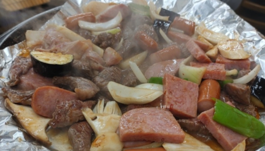 • 설명: 소고기, 햄, 소시지, 베이컨, 양파, 버섯, 피망 등 다양한 재료를 버터와 특제 소스에 철판에서 볶아내는 오리지널 스타일.