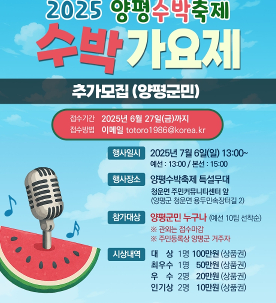 2025 경기도 양평 청운면 수박 축제는 여름의 달콤함과 건강, 그리고 가족의 추억을 모두 선물하는 특별한 행사입니다.